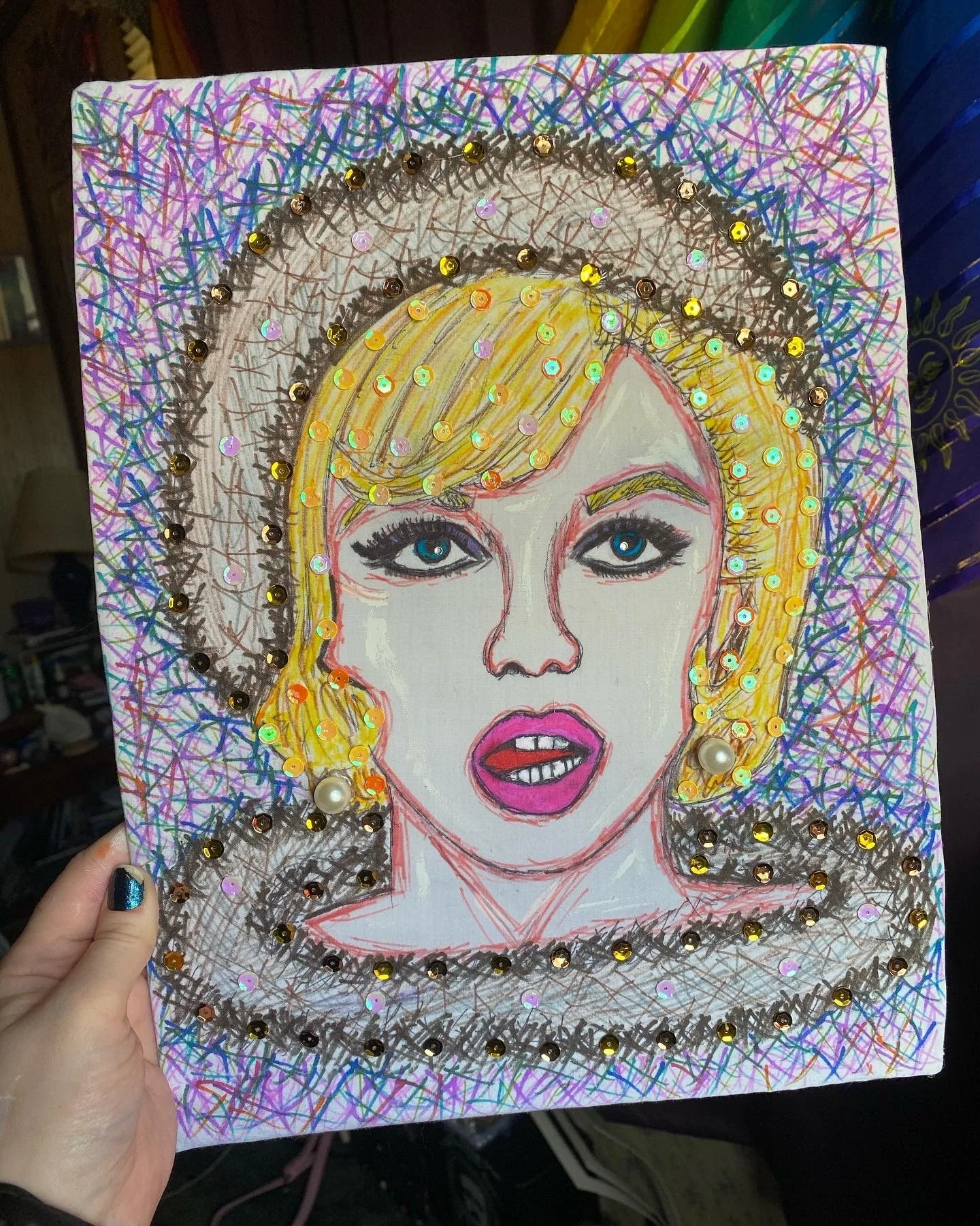 Mixed Media Collage: Fabric, Sharpie, Markers, Pearls, Sequins, Rhinestones, and Paint.
