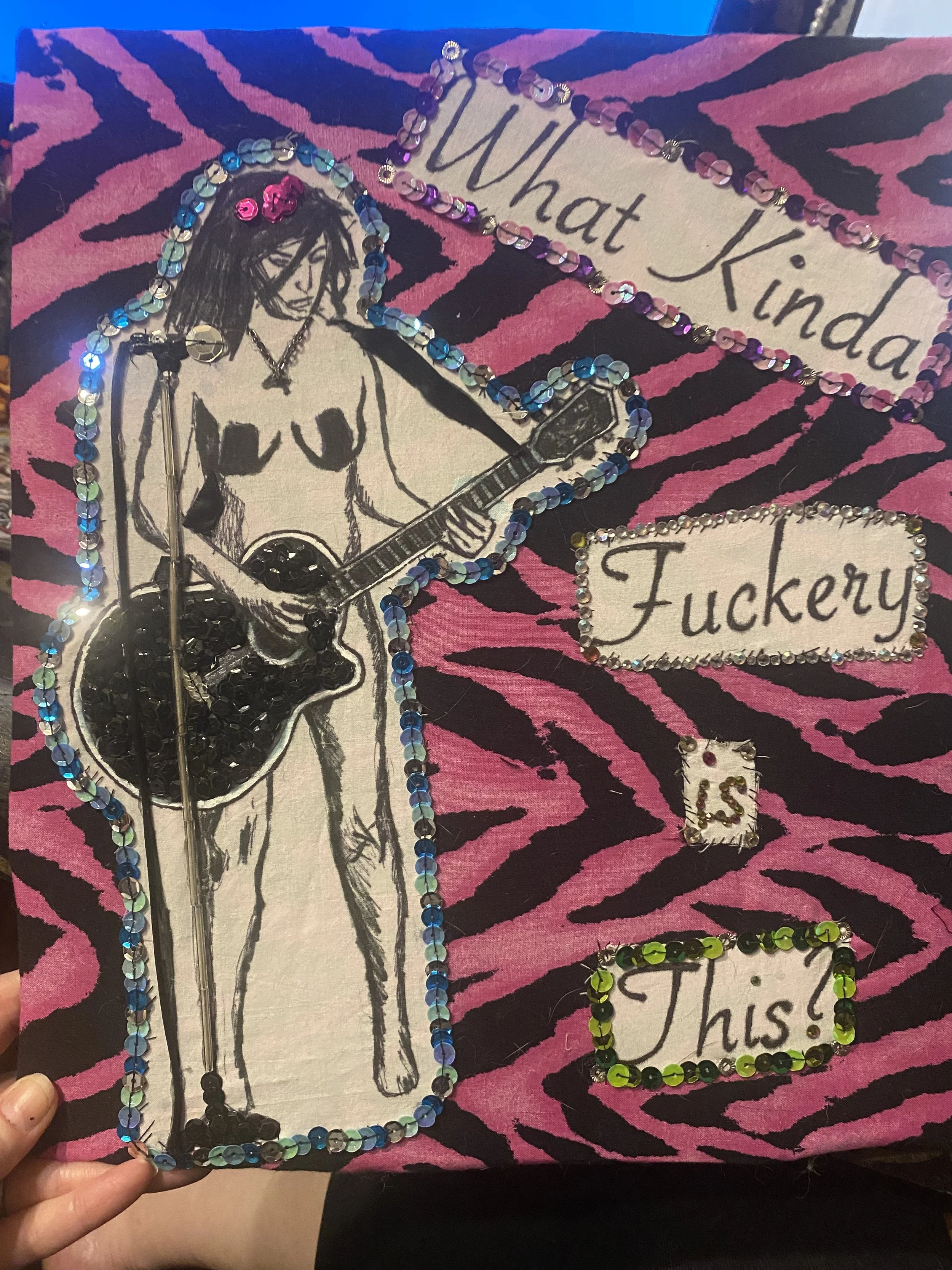 Mixed Media: Fabric, Sharpie, Glass Beads, Pleather, Thread, Metal Studded, Sequins, and Rhinestones.