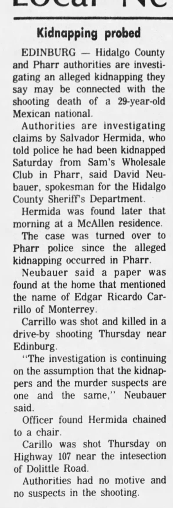 Edgar Ricardo Carrillo - On March 14, 1991, the 29-year-old Mexican national was shot in a drive-by shooting on Highway 107 near Edinburg. The only newspaper article I could find on this one started that they were investigating this murder in connection with an alleged Kidnapping. This came from claims made by Salvador Hermida who was kidnapped from s Sam’s Club and found later that morning chained to a chair in a McAllen residence. While searching the home they found a paper that mentioned Edgar on it. Since there was a kidnapping mentioned as a part of this one I could be linked to the one of Hector Alaniz Sr.