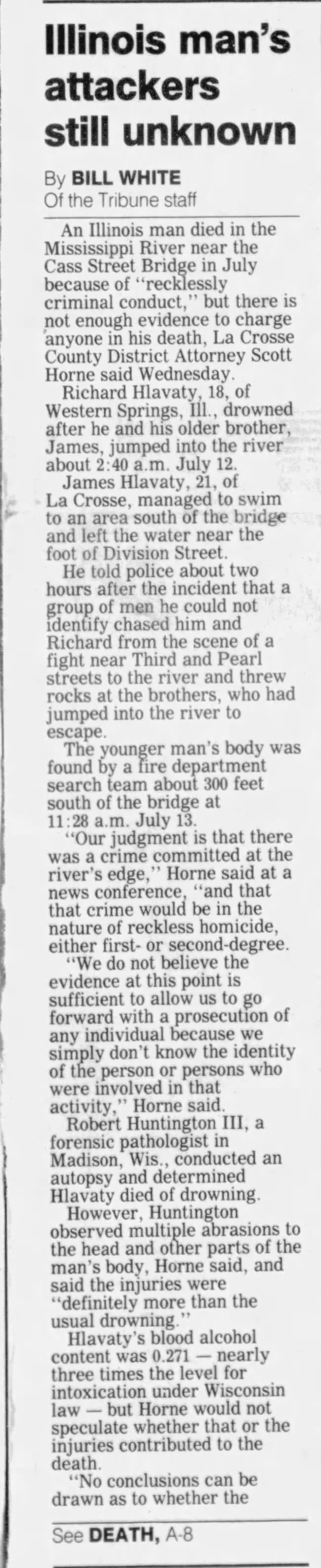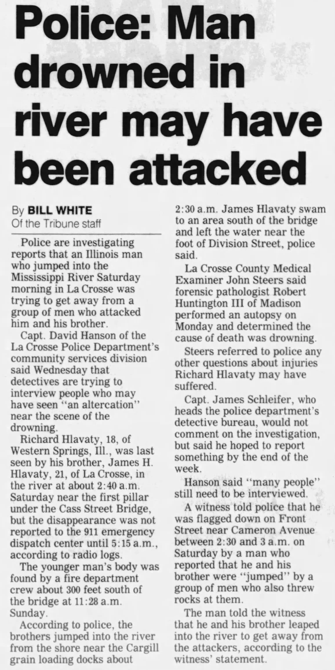 His brother James did survive this ordeal but was unable to identify the individuals who chased him. Captain of the La Crosse policed stated ‘"I take extreme issue with anyone who tries to connect evidence in the Hlavaty case to these other four deaths. The Hlavaty case is not remotely related. He was chased into the river." He also stated that foul play was involved in the death, and if the men had been identified, they would have faced charges, such as reckless homicide or manslaughter. The case was suspended by police but will be opened if they receive additional information.