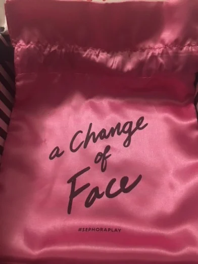 I really love this bag. It's a pink silk bag with is lovely. Plus it's got the phrase "a Change of Face". It's adorable and it's a powerful statement of what makeup can do. I feel like with makeup that you can constantly change your face to whatever you want. Well to a certain extent of course. I dig it though.