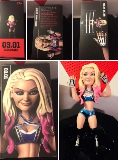 This month's figure is of Alexa Bliss. This is the 2nd women superstar I have gotten in one of these. I like that they are including women in these. I don't think this looks like her at all. Unlike the action figures that do look like her so I'm a little disappointed in that. Honestly, this one will probably just stay in the box cause I'm not a big fan of hers. She has been featured in the box before so I wish they would have used someone else. She does go with the theme of the box so I understood why it's her.