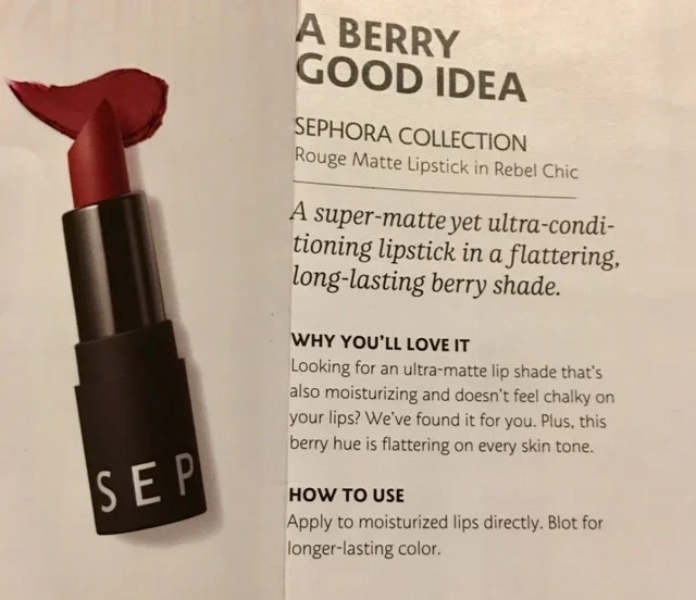 With this one, I wanted to try something new. Actually, I've done it before but it was weird so I wanted to see if I could do it better. I have included with each item a picture of the overview that Sephora includes in their pamphlet. If you don't get these boxes then you don't know how wonderful it is to get the list of what you got and how to use it. I think this is one aspect in which Sephora outshines Ipsy just a little bit. Personally I like have something I can open and look at what I'm getting instead of having to look it up on the website. Which both boxes do feature on that our their sites. This is just a little way to compare and contrast my thoughts to want the paper says.