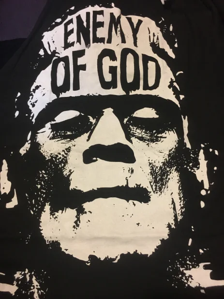 I adore this shirt! Frankenstein's monster is the ultimate Vintage Horror Icon so it's perfect they chose him. Plus he is basically an enemy of god since he was something made by man.