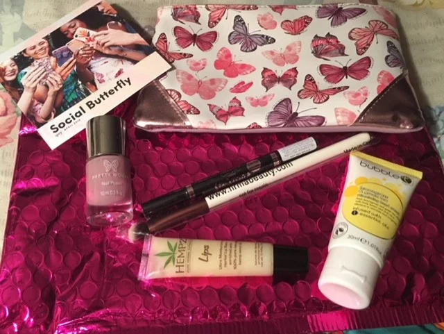 This month's theme is Social Butterfly. Basically, this bag is giving you some important tools needed to be that social butterfly you want to be.