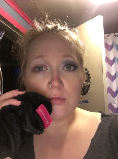 I used the black one and removed part of my face. You have wet the towel in warm water and ring out the excess then scrub in a circle to remove the makeup. As you can see above It's Pretty effective only leaving some mascara behind. Also that I'm really sad without makeup.