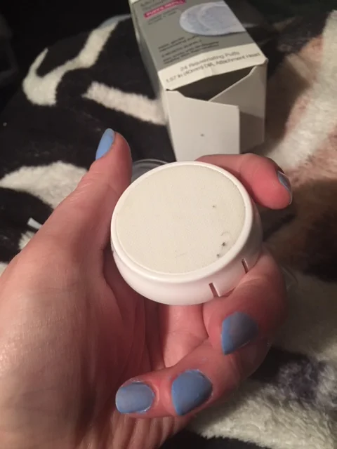 - Finally, you attach one of the puffs, wet it just a little. If you soak it you will have the product running down your face and in your eyes, which is terrible and burns.