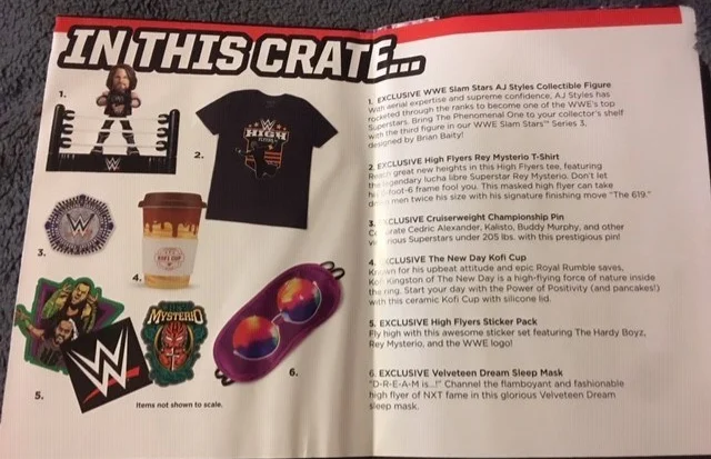 All in all, I really dig this box. It's one of my favorite they have had in a while. I usually get something I'm not into. They didn't pick the same old superstars they usually do they did expand a little bit. However the poster and the stickers they could have chosen someone different cause there are so many high flyers, especially with 205 Live being a thing now. They could have used other like Finn Balor and Seth Rollins who are big High Flyers, but they have been a feature in a couple boxes so I am happy with these choices here.