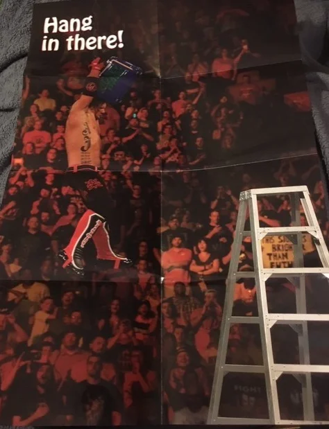 This may be my favorite poster they have ever put in here. This is, of course, AJ Styles from Money in the Bank in 2017. In case you are wondering what the hell is happening here. Just as he was grabbing the Briefcase Dolph Ziggler snatched the ladder from underneath him. He hung there for a couple secs before falling and hitting hard in the ring. I think what does it for me is the Hang in There! It just brings it all together.