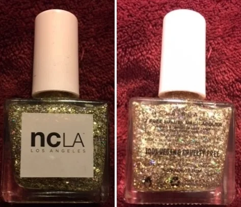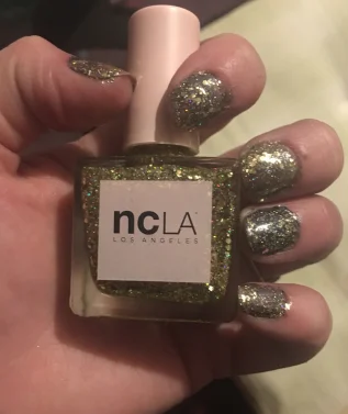 This is NCLA Nail Lacquer in the shade This is Hollywood, which is basically just a clear coat that is packed full of 3 types of brilliant gold glitter. This is the 2nd polish from this brand they have included in these bags. I wasn't too happy with the last one, but this one I do enjoy more. I think it's just where it's basically a clear coat it can be added over of polish as a top coat. I used it alone and had to use 3 or 4 coats for it to look like glitter polish with no gaps. There wasn't a whole lot of chipping which I was impressed by since the other one did the next day. I really dig this one and have been putting it over every polish I have used the past 2 weeks.