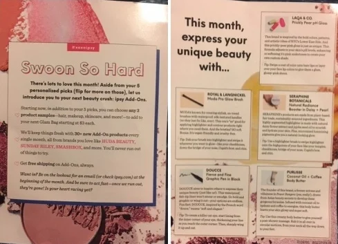 This month's theme is Swoon So Hard. They changed up their card format to include the theme on the front and the products listed on the back. Which I dig since that's the one thing I like about my Sephora box is they give us a list and tips. So I will be including the item description along with the product.