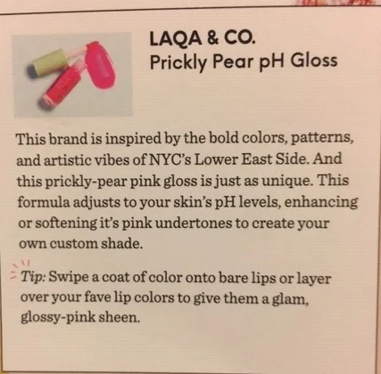 Laqa & Co's Prickly Pear pH Gloss, which is something new that I've not heard of. I'm all for a lip product so I will try anything. This is gloss with a light pink tint to it. It's not a highly pigmented tint which is perfect. Some gloss goes way overboard with that sometimes. The gloss itself is light and doesn't feel like I have buttered my lips. Plus it's not sticky which is my one issue with glosses. I hate a gloss that feels like glue, dries out my lips, or even worse makes my hair stick to it. I have no time for that kind of bullshit. This one is pretty great and doesn't do any of those things. It lasts stays on a good while and leaves my lips feeling super smooth and moisturized after it fades. Also, it smells faintly of pears, which is kinda of lovely. I dig it and will use it up. I will also be looking into the brand more.