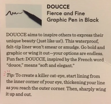 Doucce's Fierce and Fine Graphic Pen in Black. This is another brand I have never heard of, but I am down for some eyeliner. This one is a sleek black matte pen which I can't recall ever having one like this. This felt-tip is great for making the perfect wing of any size. The way it's designed you can do it lightly or go bolder whichever you prefer. This one is waterproof so it does last a good while. I had to make a second round with my makeup remover wipe to get it off completely. I'm quite pleased with the one and would totally buy it again.