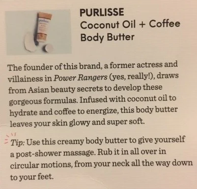 Purlisse Coconut Oil & Coffee Body Butter. This is another brand I have gotten before in one of these. This formula isn't really a body butter it's a little too thin than normal body butter is. It goes on fairly smooth it is a little greasy to me, but it does absorb into your skin and leaves it soft. This stuff smells strongly of coffee with a hint of coconut. While it does do its job to make my skin soft I wouldn't purchase this one again since I don't care for lotions this thin. If you like something a little lighter then this is perfect for you.