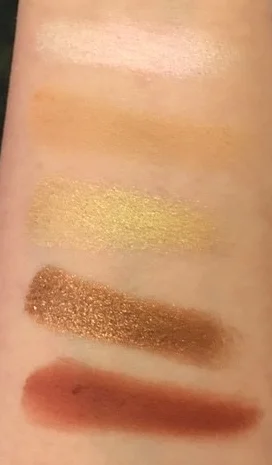 All the shades in this one are on the warm side which I'm going to break down by row. Remember I'm super pale so color may appear differently on me. Also, these don't have names so just descriptions.