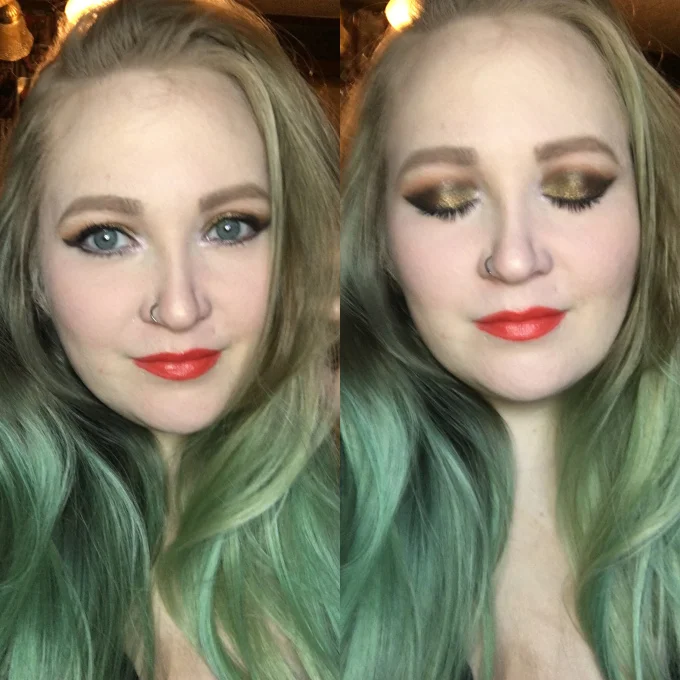 I created a little look with one. I used the palette on my eyes with the brushes. I used the Kokie eyeliner on my top lid and the JCat under my waterline to get a cool bronze glow. Also, the Bang lipstick which you can tell is just an odd color on me.