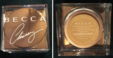 Confectionary Glow Powder Loose Highlighter in Cinnamon Sugar. This stuff is in this perfectly symmetrical square jar. Actually, the square is clear plexiglass but the lid has a round gold lid within it top and then the golden power in the bottom that makes the whole thing appear gold.