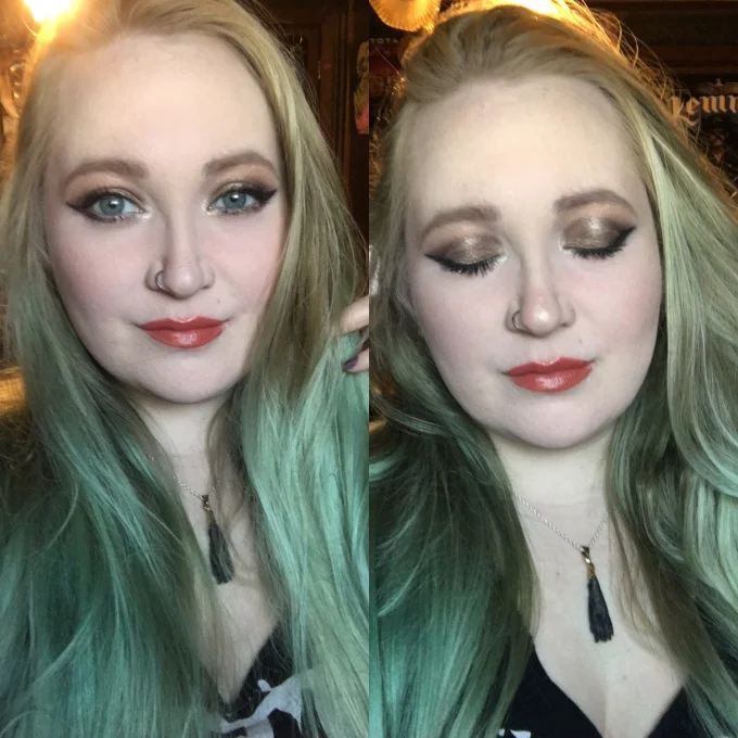 Here is a look I created using all the products in this set. I used the eyeshadow and gel highlight combined with the loose pigment on my eyes. I used the loose highlighter to highlight and then, of course, finished it with the lipstick.
