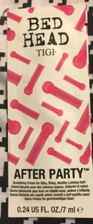 TIGI Bed Head After Party Smoothing Cream. I have not used Bed Head since high school which was over 10 years ago so I was excited to give it a try. This stuff you use on your dry hair just to try and contain it which is always needed sometimes. I put my hair in a high pony then used this to tame the flyaways. It works perfectly and smells amazing. I dig it and would buy this again.