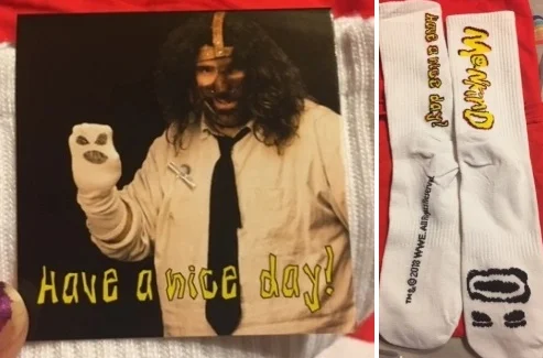 These are Mankind Mr. Socko socks. If you are a wrestling fan then you know and love Mr. Socko. He was a big part of my childhood so I was pretty excited about these. One of these socks is Mr.Socko with the Mankind logo at the top which I like cause I feel like both would have been overkill. The other one just says Have a Nice Day on the top of it. Unlike the last 2 pairs of socks I've gotten in these crates, these are actually stretchy enough to be comfortable. These are really genius and fit the theme perfectly since the moment you hear Mick's music you know it's gonna be a good time. I love these and will wear them to death.