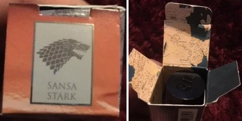 Starting with the True Queen of the North, Sansa Stark. She is the eldest of the Stark girls and has been through some bad shit. It only made her stronger and that much more of a badass. The box for this one is Stark colors with the Direwolf symbol.
