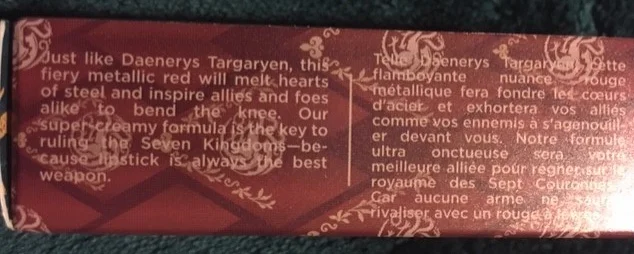 Daenerys of the House Targaryen, the First of Her Name, The Unburnt, Queen of the Andals, the Rhoynar and the First Men, Queen of Meereen, Khaleesi of the Great Grass Sea, Protector of the Realm, Lady Regent of the Seven Kingdoms, Breaker of Chains and Mother of Dragons. They carried the same box design as the Dracarys stain and it's perfect for the Targaryen house so why change it.