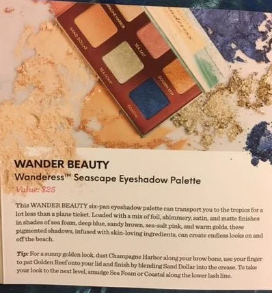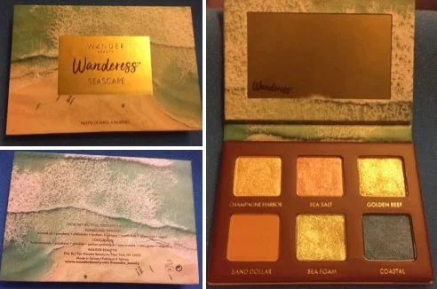 Wander Beauty Wanderess Seascape Eyeshadow Palette. I have tried a couple thing from Wander with no issues so I was happy when I saw this in the box. I knew I wouldn't have any real issues out of it since it was a brand I knew. They put the full sea theme on the box with the shades on the back.