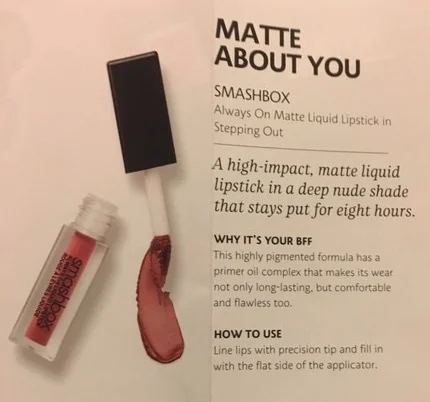 Smashbox Matte About You Liquid Lipstick in Stepping Out. I really like Smashbox they always come through with legit products. I love lipstick so of course, I was excited. I was worried because I thought it would be to light. However, I was impressed with this creamy matte lipstick that is a brownish pink with hints of red. It actually looks pretty stunning on my pale skin. It stays on for hours with little fading and it doesn't dry out your lips completely. Also, I can apply lip balm over it without it taking all of it off. I really like this and would buy it again.