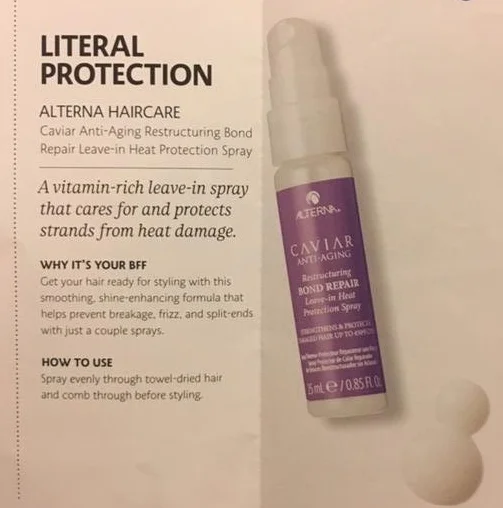 Alterna Haircare Bond Repair Leave-In Heat Protection Spray. Since I got this in my Ipsy bag as well I just copy the review from it. I'm always up for a leave in conditioner. Anyways I washed my hair and applied a ton of this stuff to my hair like I do with these kinds of things. I brushed my hair and went to sleep, I don't know if it's cause I didn't braid my hair or what but my hair was kinda stiff but has some volume to it. This stuff didn't make my hair soft it just stiffen it up so that it didn't tangle. I tried it again a few days later and used less. My hair still had that same feeling to it but not as bad. Definitely more manageable. The smell is a little strange but not completely off-putting. However, I wouldn't buy this again it just didn't work the way I like my leave-in conditioner too.