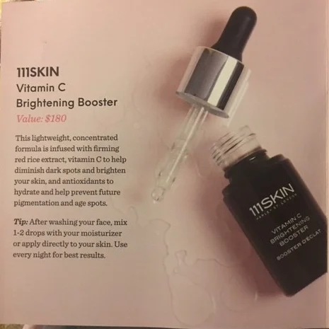 111Skin's Vitamin C Brightening Booster. This is a brand I haven't heard of but I have recently been using a serum at night. This one is super light. I use a few drops and warm them up between my hand then apply to my face. I have used it alone and mixed with a moisturizer. It works perfectly both ways and is easy to apply. It soaks in pretty quickly and leaves my face soft with a slight glow. I dig it and will use it to death.