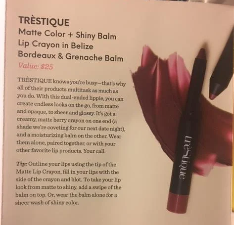 Trestique's Matte Color + Shiny Balm Lip Crayon in Belize Bordeaux & Grenache Balm. I really dig this brand. I get one every once in a while and they are always amazing.
