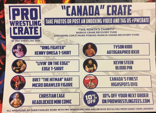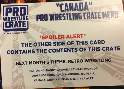 So If you read or follow this blog then you know that I am a big wrestling fan. In being such I love the crate and various wrestling merch. So I have been following this box for a while since it's part of Pro Wrestling Tees who if you are a Wrestling fan need to check out. They do this monthly crate that has a theme. The Theme for January was Canada and I love Canadian Wrestling. Honestly, the only reason I got this box is cause it said it features Owen Hart who is my all-time favorite.