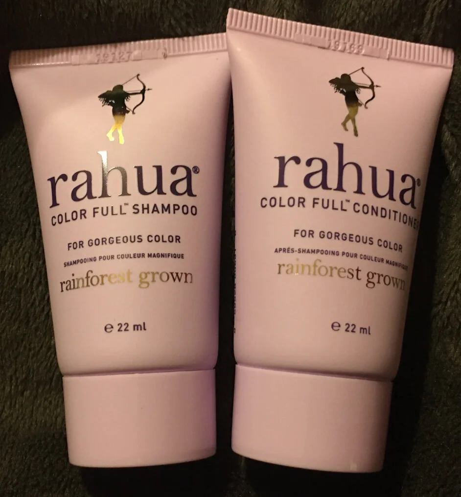 Rahua Color Full Shampoo and Conditioner. I don't think I've heard of this brand, but I'm into hair care. Also, this may be the biggest sample of shampoo and conditioner I've ever gotten. First off this stuff smells incredible like sweet roses. The shampoo lathers up really well and washes out with ease. The Conditioner goes in and covered most of my hair \pretty well. I did still have to use my normal conditioner since my hair is so long. I let it air dry as I always do. It left my hair to untangle and super soft. I like it and would buy it again.