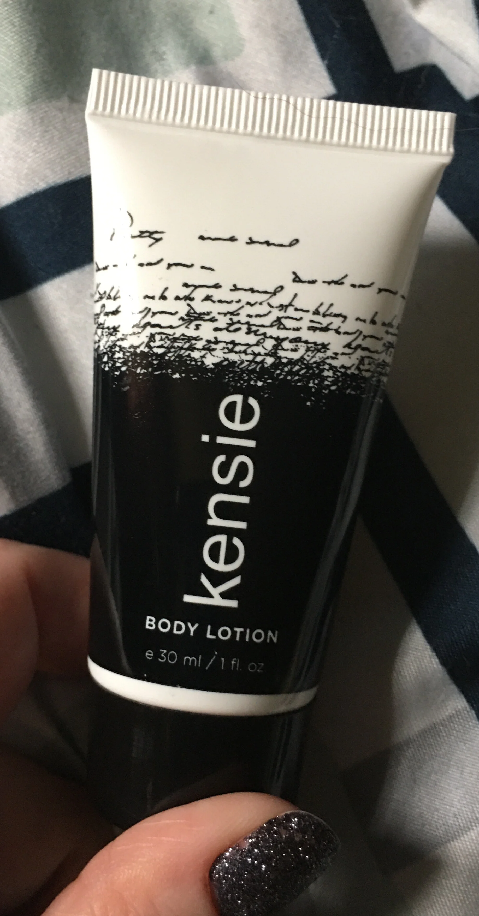 Kensie Body Lotion. This is a thick lotion that smells incredible. It goes on smoothly and absorbs fairly quickly. It does leave my skin moisturizer and soft. However, after using it a couple of days I did break out in a slight rash. I don't know if it's the lotion itself or the combination of it and something else. I had to stop using it and it cleared up. That could have just been me though.
