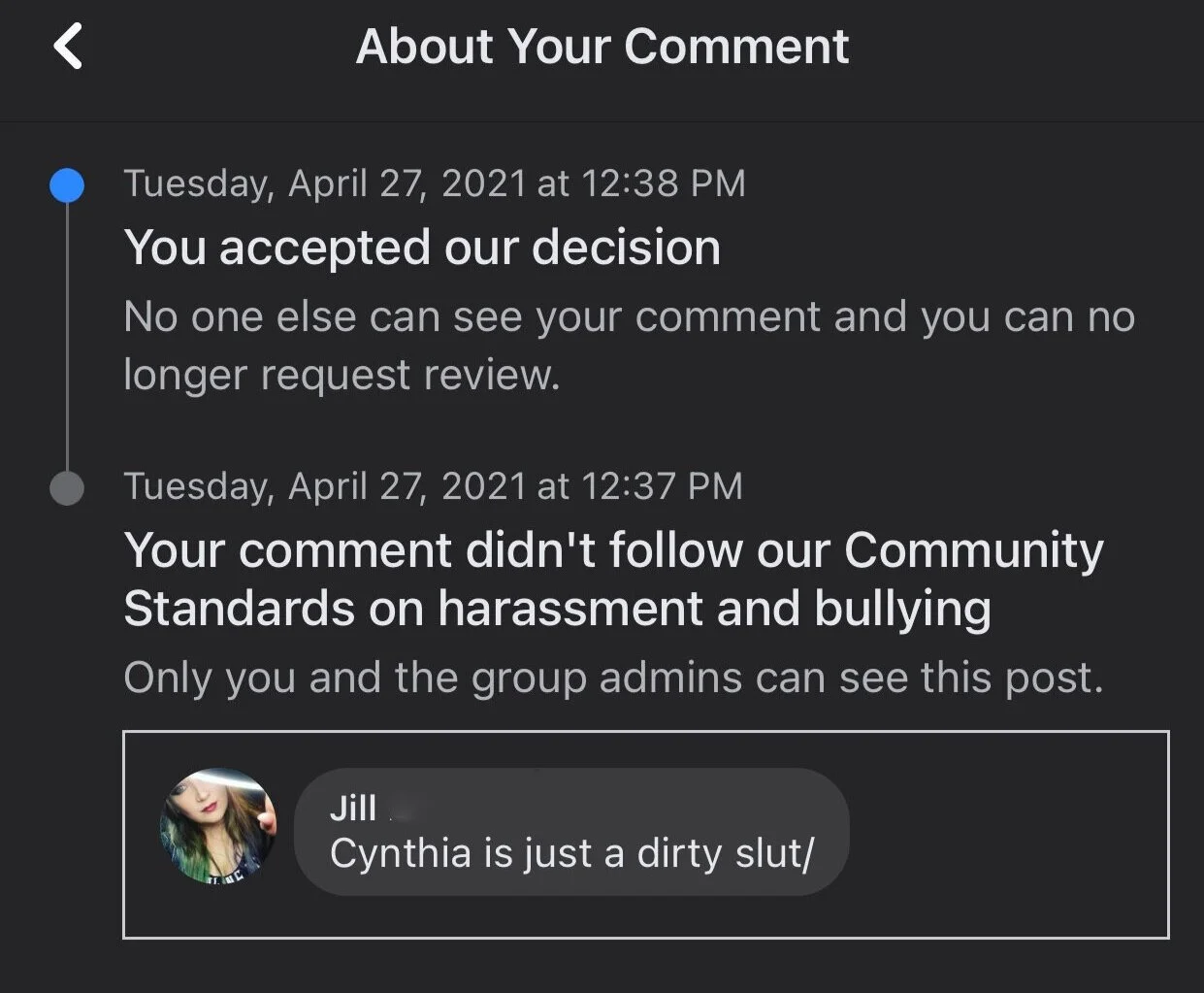 This one got me in Jail for 3 days. It was also on a post in the same group and Cynthia is not a real person. I get this one in a way but I also wonder if I referred to myself as a Dirty Slut would it get flagged too?
