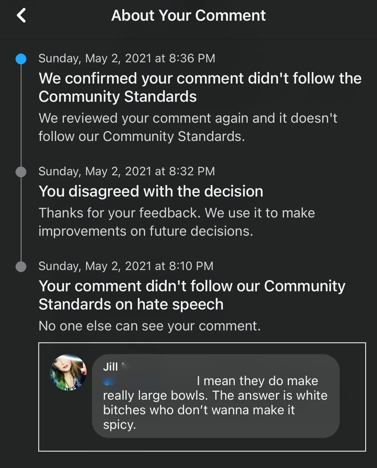 So what you are saying is I can call them dumb white bitches but not white bitches cause that’s considered hate speech and bullying? What sense does that make? Sir, I myself am a white bitch. I know it’s a weird landscape these days with everything. However, this should not be the biggest concern this platform has. I have seen people call other awful names and wish death on them. I mean shocking shit that has made me unfriend people for saying nasty things about protesters and Trans people. This was also the platform that let our last president broadcast his hate speech all over it. The same one who has let people go live and shoot other people and watch people beat the shit out of each other. However, most of it gets missed unless people report it.