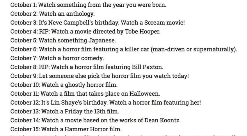 So this movie I decided to do a movie challenge for October. You know cause it’s Halloween and the perfect time for it. I had a friends post this list below that they did last year. I’m going to be doing this in 2 parts So it’s not so much chaos.