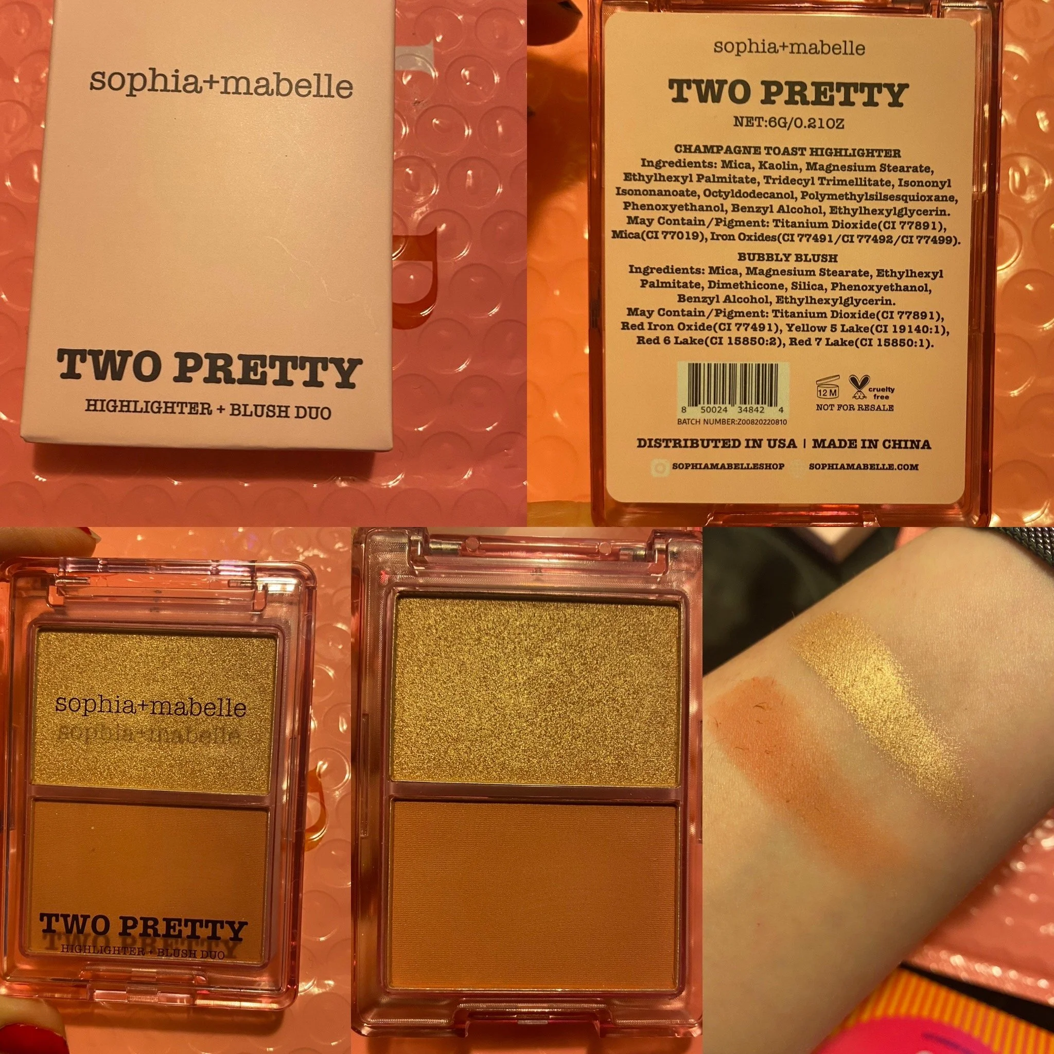 SOPHIA + MABELLE Two Pretty Palette in Bubbly and Champagne Toast. This is another brand I haven’t heard of. I didn’t really dig this full-size duo. It’s got the blush which is a warm peachy pink. It matches my skin tone very well without being too much, but it can be layered if I wanted more of a brighter blush. The highlighter is a golden white with pink undertones, which works very well with the blush. I’ve been able to use it to highlight various parts of my face. Neither of these have rebelled with any of my other products. I actually keep this one in my purse for when I have to leave the house. I’m definitely gonna be checking this brand out more.